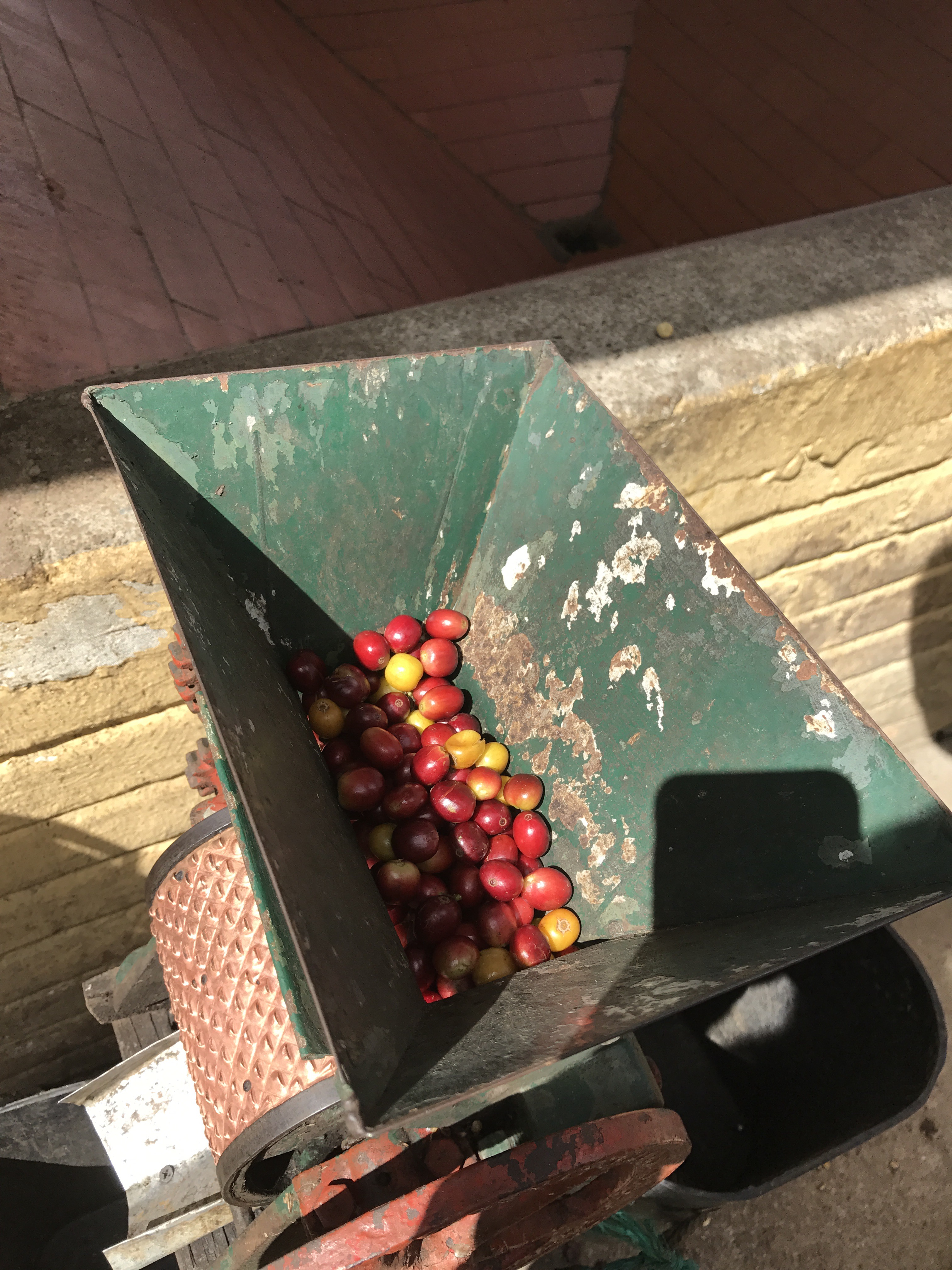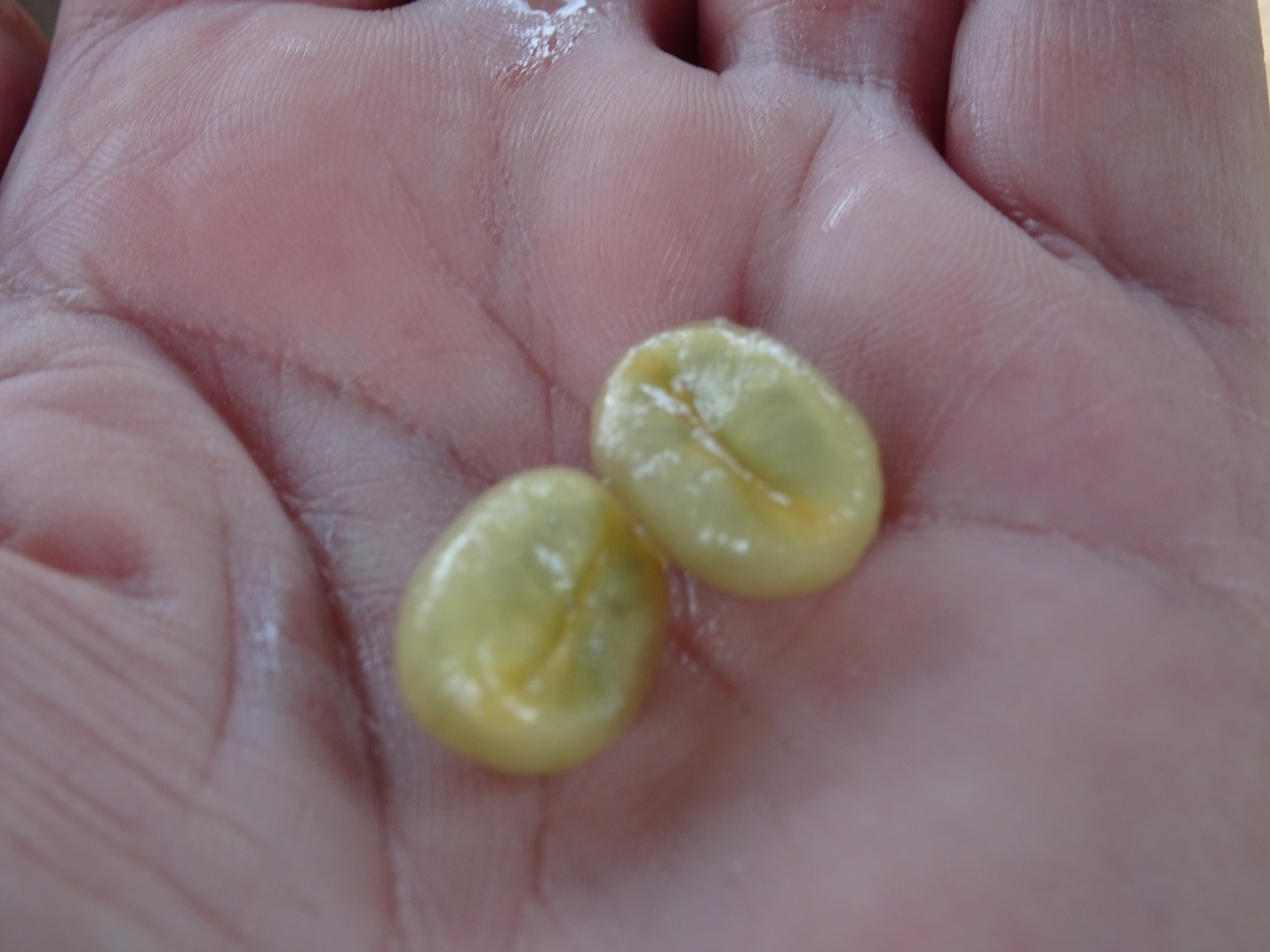 Chaque « cerise » comme ils l’appellent à deux grains de café appelés Pergamino. Quand la « cerise » est rouge c’est qu’elle est prête à être récoltée.