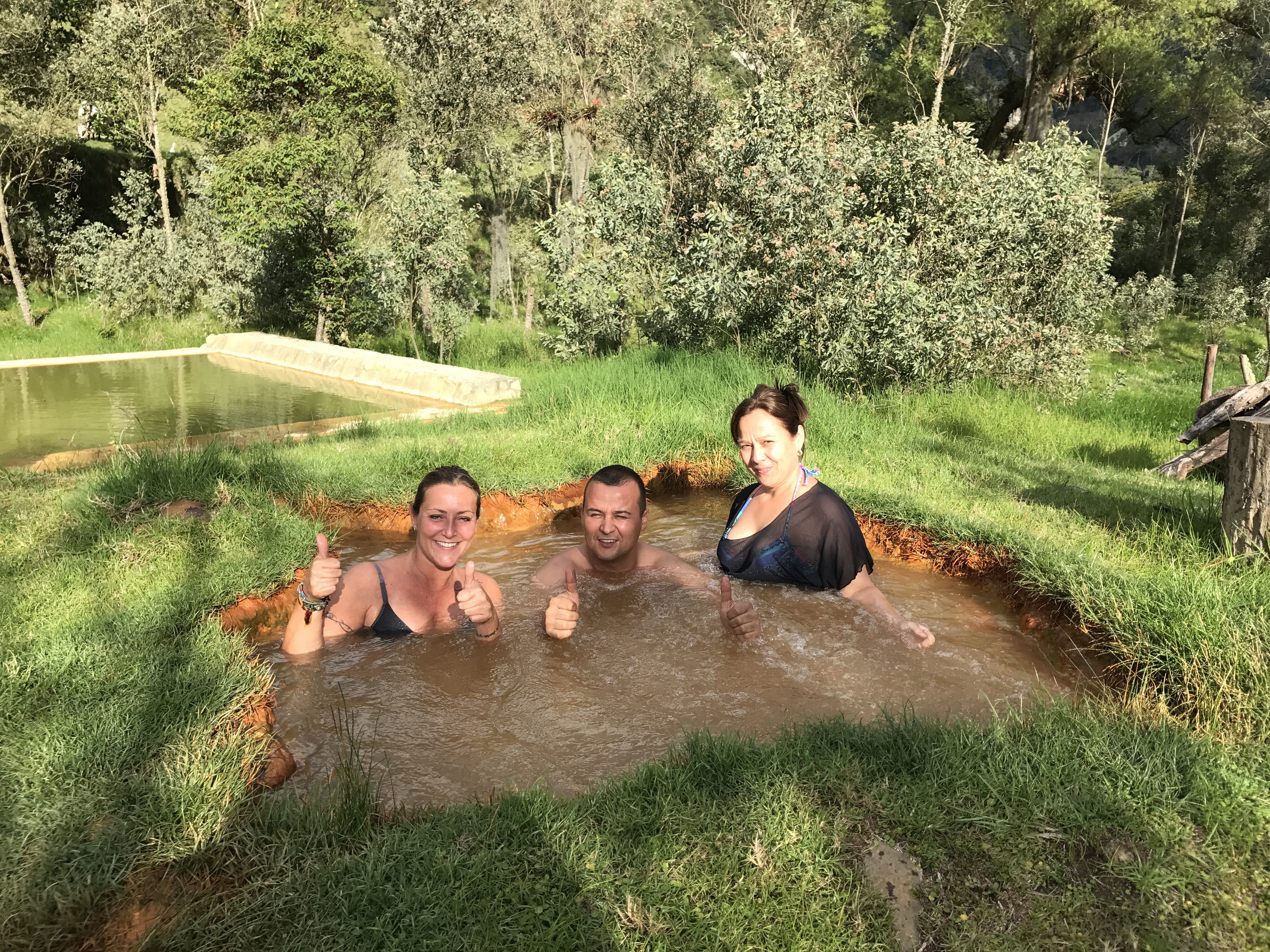 En sortant de la finca, deux jeep s’arrêtent et me proposent de monter. Comme il est de coutume de retourner à Salento par ce moyen de transport, je monte. Là je découvre que c’est deux familles de Calarca, village à une vingtaine de kilomètres qui partent découvrir la vallée de Cocora et une source thermale. Arrivés à Salento, ils me proposent de passer la journée avec eux. Après un court moment d’hésitation, j’accèpte, je me sens en sécurité, il y a la grand-maman, les cousins, les oncles, tantes et tutti cuanti !