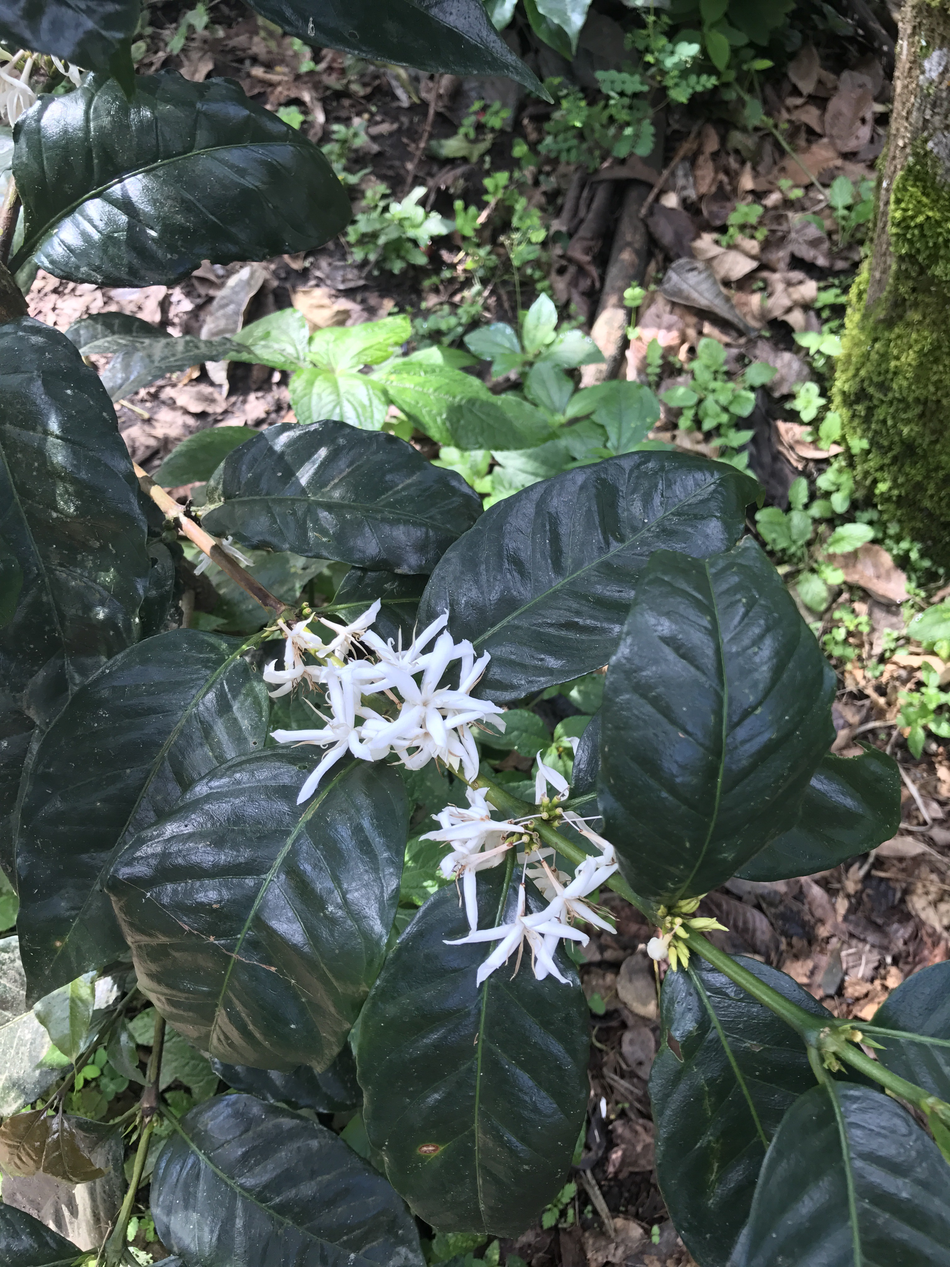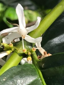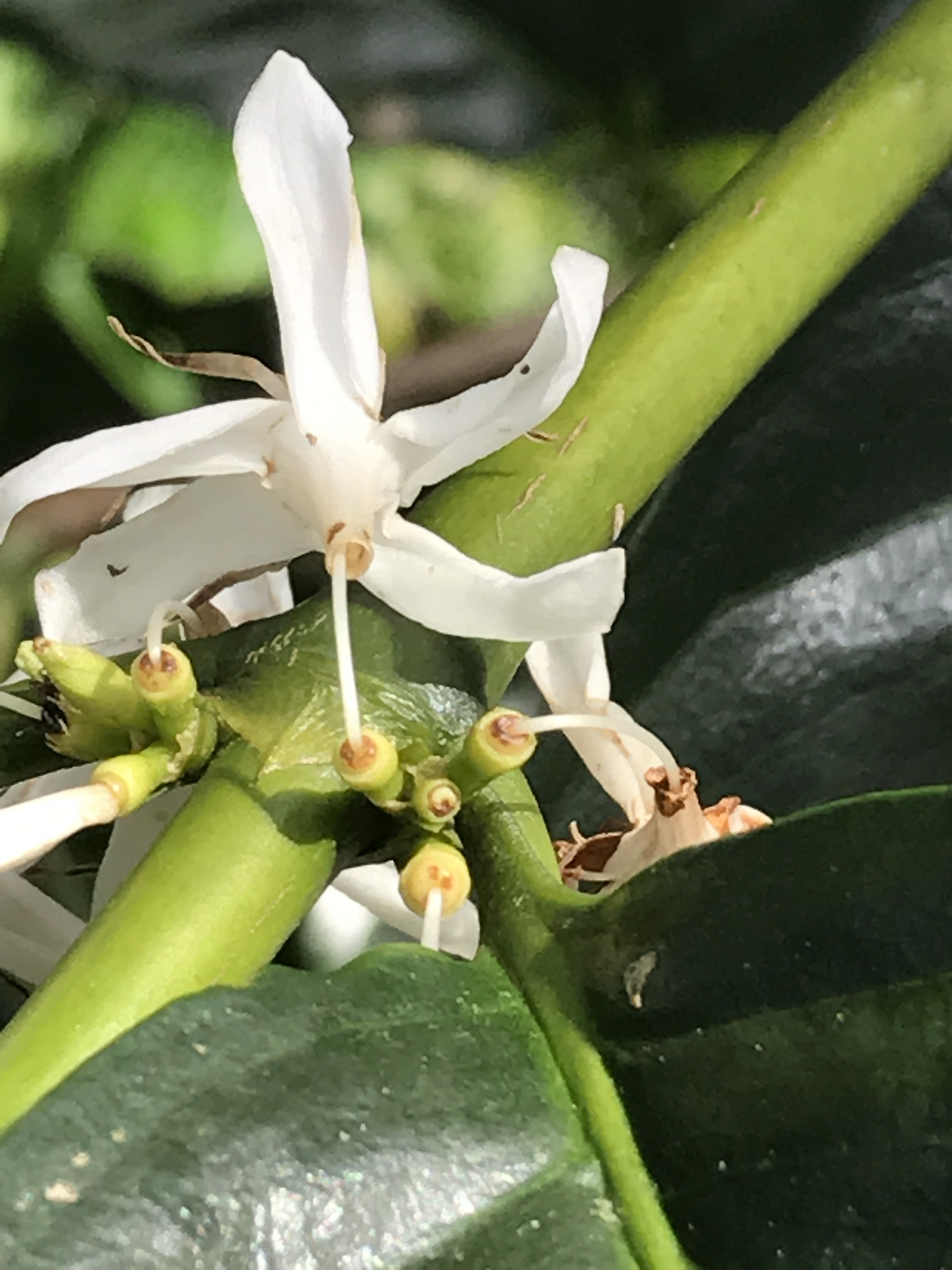 Il faut 18 mois pour avoir les premières fleurs.Chaque fleur blanche va donner une cerise de café avec deux grains à l’intérieur. La durée de vie d’une fleur est de 3 jours ensuite elle tombe et pousse la cerise (verte au départ). Les fleurs sont hermaphrodites, elles ont besoin autant d’eau que de soleil.