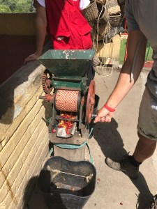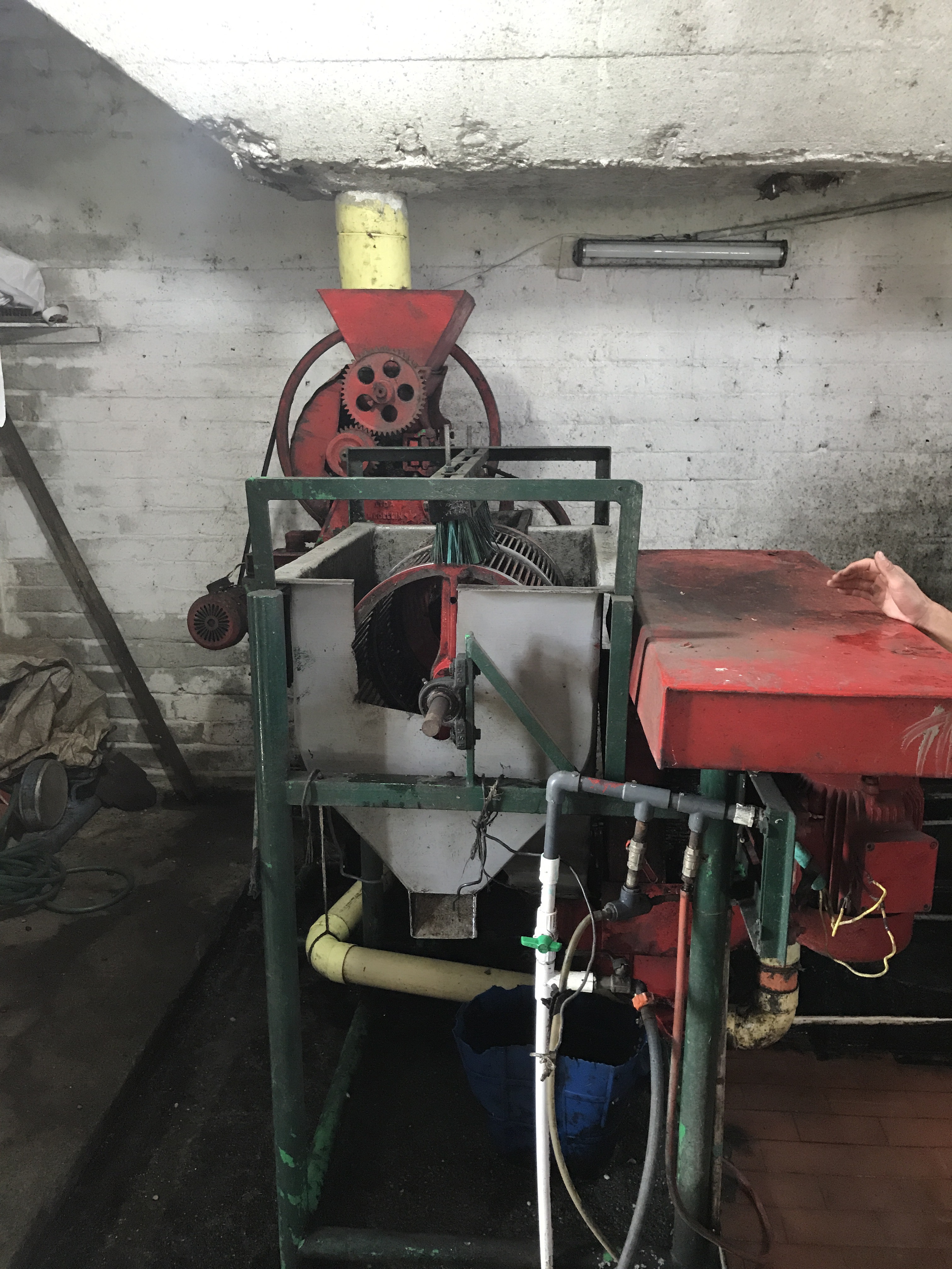 Les « cerises » passent ensuite dans une machine pour enlever la pulpe rouge qui part au composte.