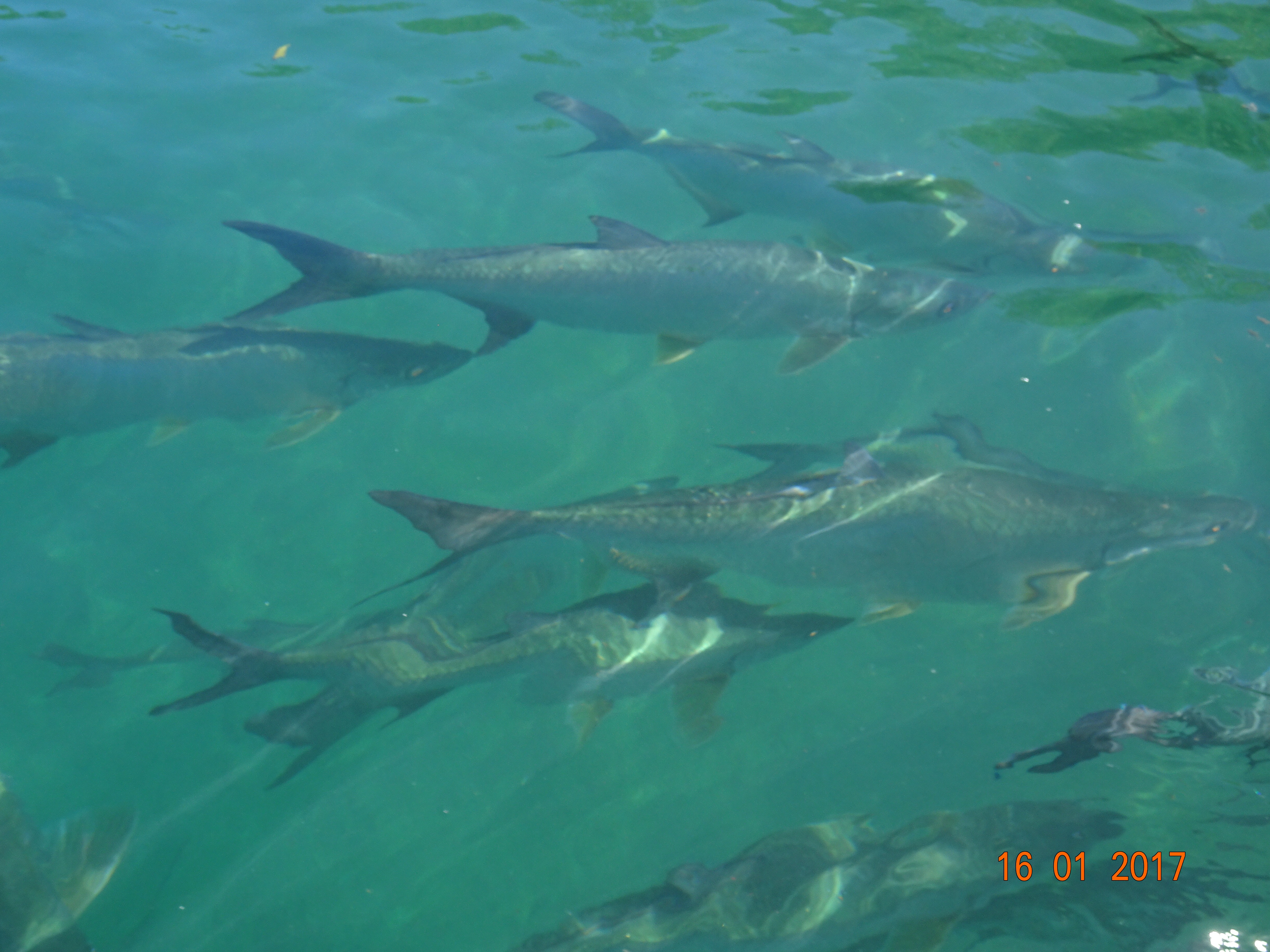 Poissons qui sautent hors de l’eau pour attraper les sardines que l’on tient entre nos mains